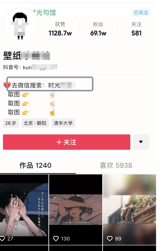 抖音壁纸号的变现主要是通过主页签名留下联系方式,引导粉丝去到微信公众号下载高清图片,实现流量的积累,后续通过公众号广告接单或者其他产品销售来变现。